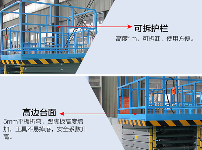 3.工作平台的抽插可拆卸式护栏,方便拆卸,可以减少存储空间,方便进出有高度限制的场所。