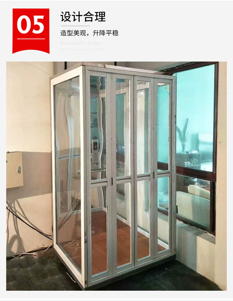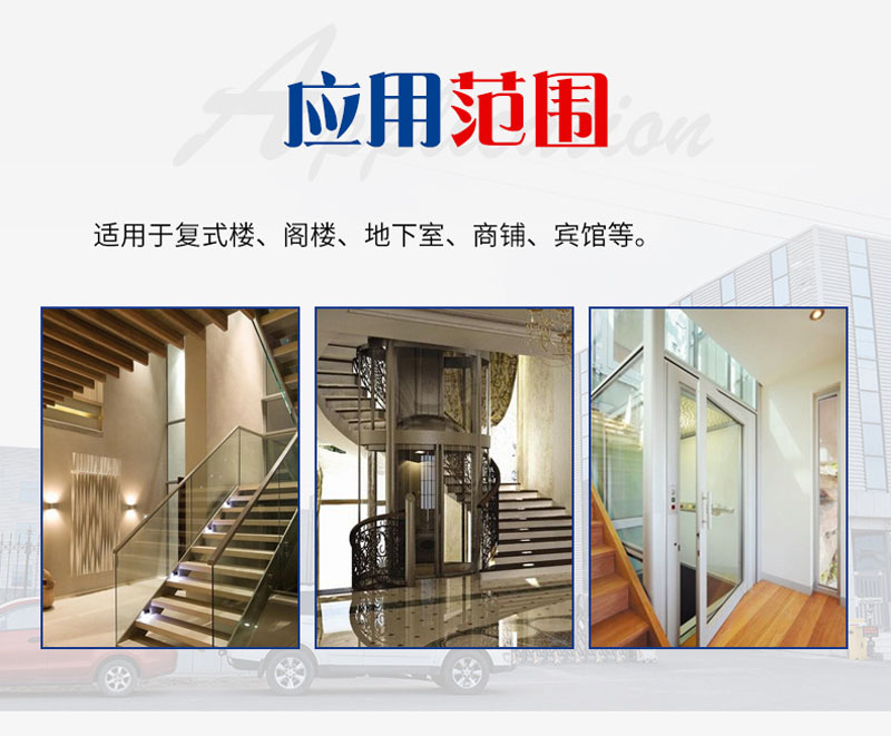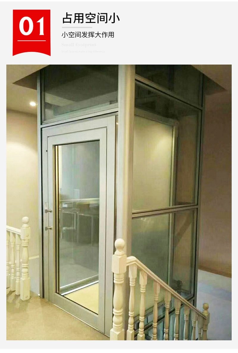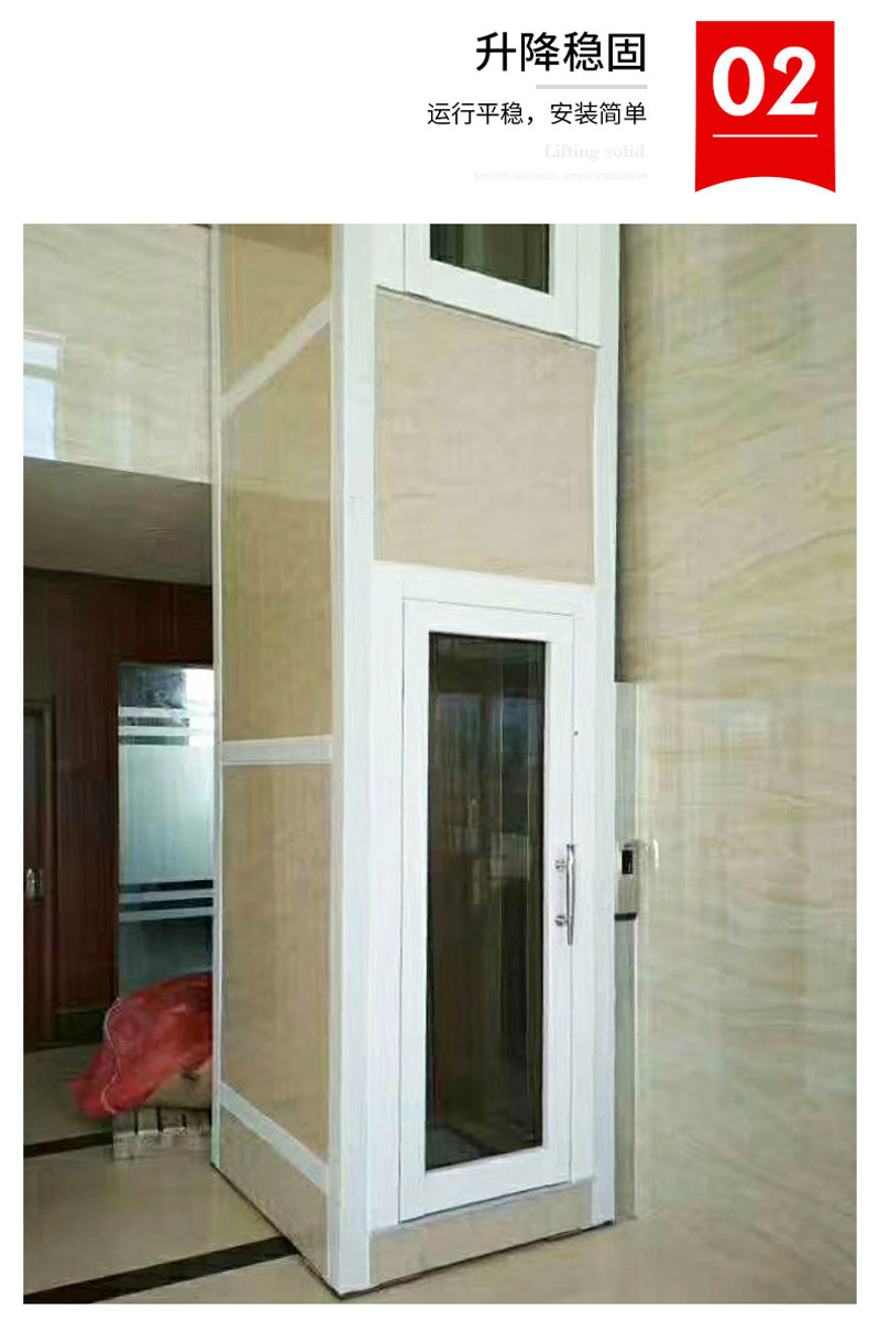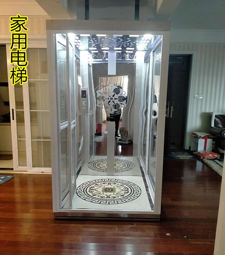 曳引家用电梯或别墅电梯:井道及地坑、轿厢、层站部分;主要部件:曳引系统、导向系统、门系统、轿厢、重量平衡系统、电器控制系统、安全保护系统,电气方面的安全保护在电梯的各个运行环节都有,这种电梯同小区电梯相同。安静平稳、价格经济、乘坐舒适,方便残疾人和老年人使用的家居电梯。
