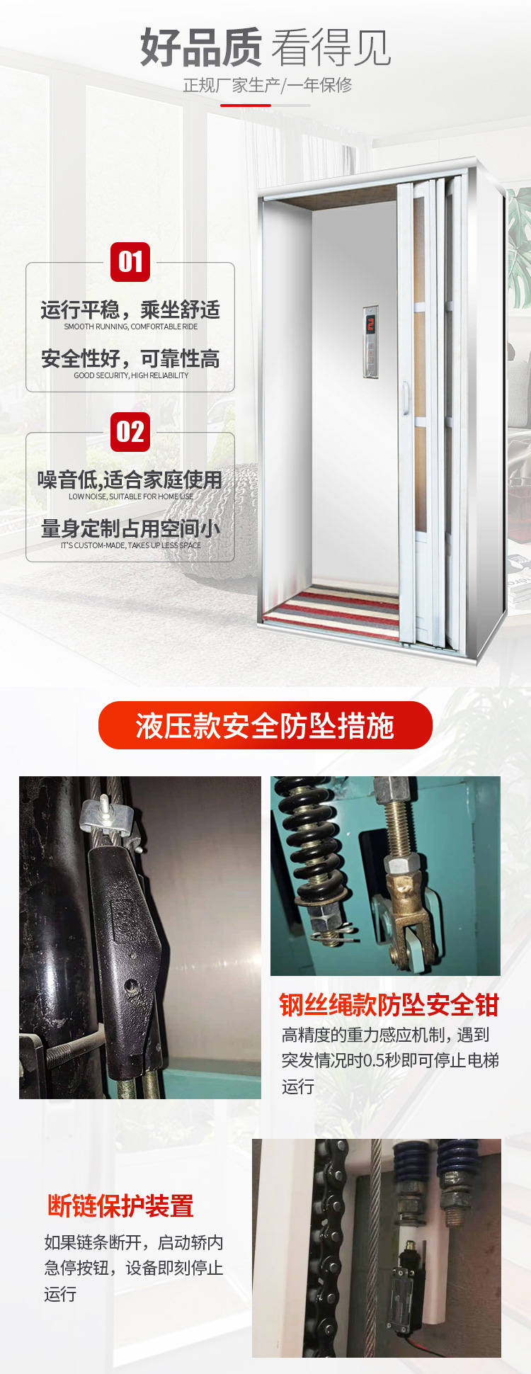 别墅升降机手拉门(及手动门)的结构类似于我们家里常用的门,有门锁联动装置和比较重。有安全装置系统:有停电应急、电磁锁、减震器、变频器、漏电保护器等多处为了人们使用家用电梯安全设置。升降平稳、操作简单、优质价廉、载人载杂物均可。为人们提供了方便,节省了时间,为工作提供了效率。