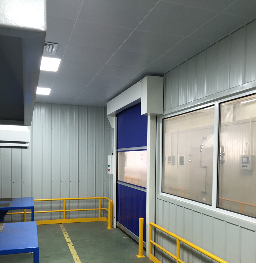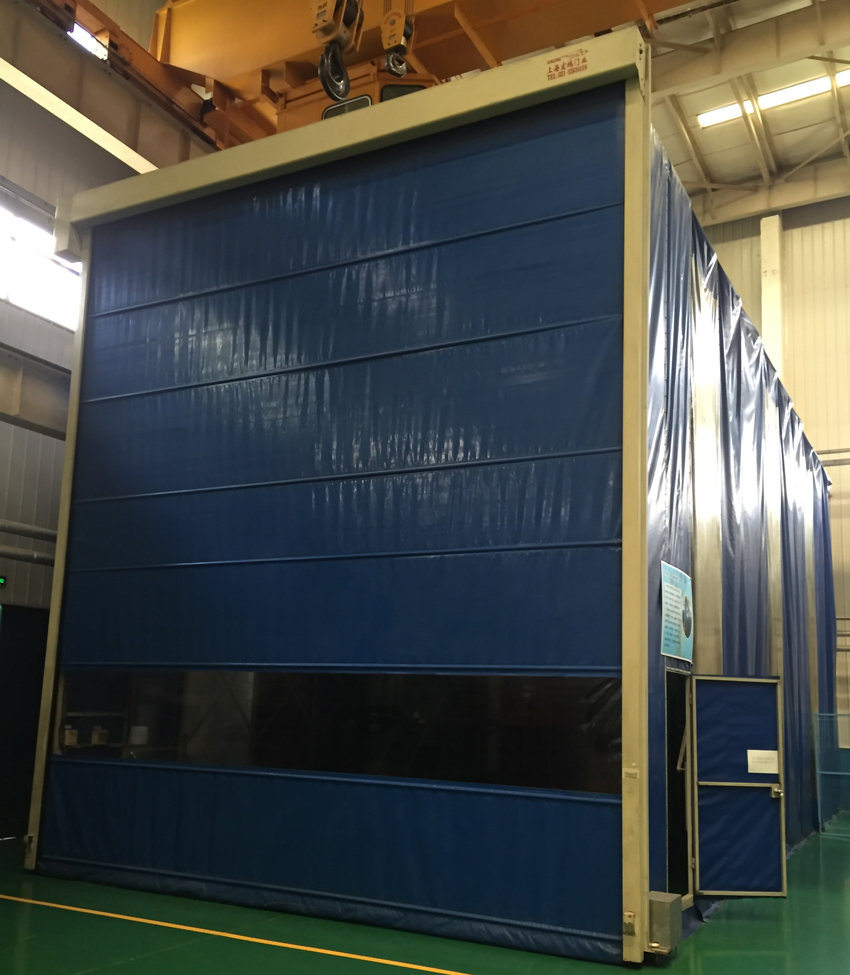 该门是设置在常压状态下建筑物内部通道出入口,用软帘布做成的快速自动卷帘门。门体使用有弹性而坚韧的专用高密度聚氯乙烯涂层织物软帘,实现了门体的高速开闭(比钢质卷帘门的速度要高约20倍),极大程度的缩短了通道出入口的开放时间,不仅提高了车间内部空调的效率还能将车间外部异物混入率控制在最小限度。大大提高工作效率。为实现安全、卫生、节能的工作环境,为提高产品质量作出贡献。
